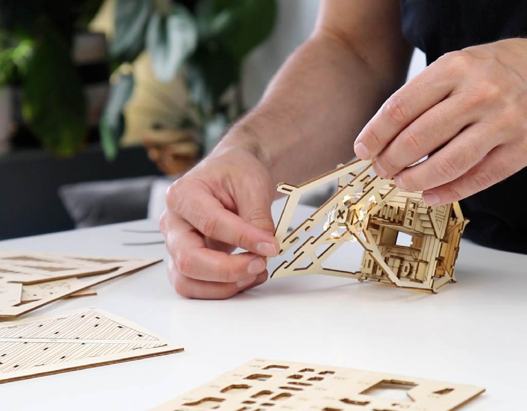 Every 3D puzzle comes with battery operated LED lights to give your Tiny Treehouse and plants a warm and magical glow.